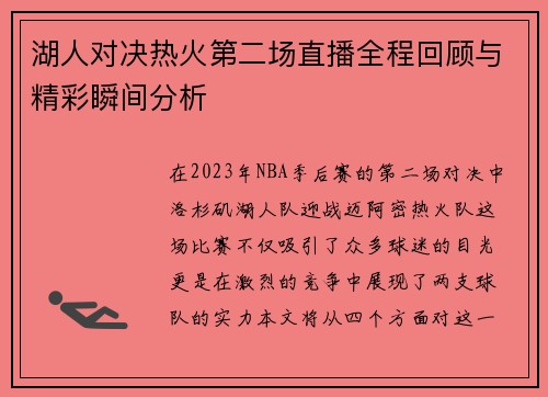 湖人对决热火第二场直播全程回顾与精彩瞬间分析